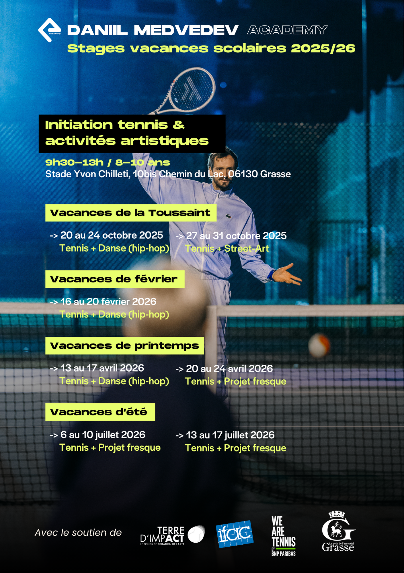 De sa propre initiative, elle propose des actions associant tennis et activités créatives ou culturelles, à partir du court Daniil Medvedev, situé au 10bis Chemin du Lac à Grasse (06).