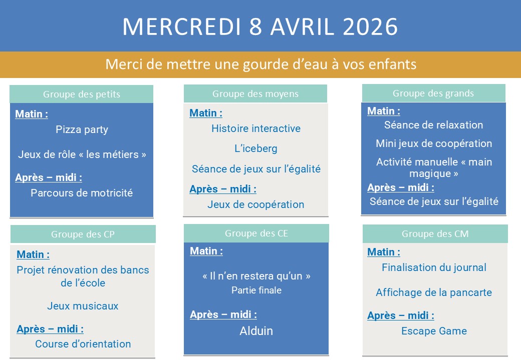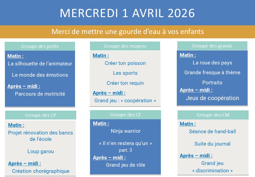 Accueil > Actualités > Nos plannings pour les mercredis d’avril en maternelle et en élémentaire au Plan Nos plannings pour les mercredis d’avril en maternelle et en élémentaire au Plan Planning Téléchargez nos programmes Planning mercredi 1er avril Planning mercredi 8 avril